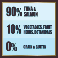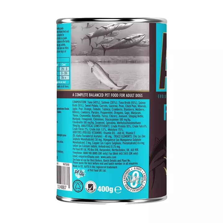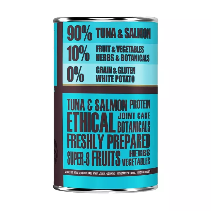 - Tuna (40%), Salmon (20%), Tuna Broth (15%), Salmon Broth (15%), Sweet Potato, Carrots, Lucerne, Peas, Chick Peas, Minerals, Apple, Pear, Orange, Tomato, Tapioca, Cranberry, Blueberry, Mulberry, Bilberry, Cowberry, Parsley, Peppermint, Oregano, Sage, Marjoram, Thyme, Chamomile, Rosehip, Yucca, Chicory, Aniseed, Stinging Nettle, Marigold, Fenugreek, Cinnamon, Glucosamine 100mg/kg, Chondroitin 100 mg/kg, Seaweed, Spirulina, Methylsulfonylmethane 10mg/kg