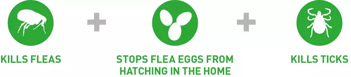 KILLS FLEAS, TICKS & LICE, PLUS STOPS FLEA EGGS HATCHING IN YOUR HOME