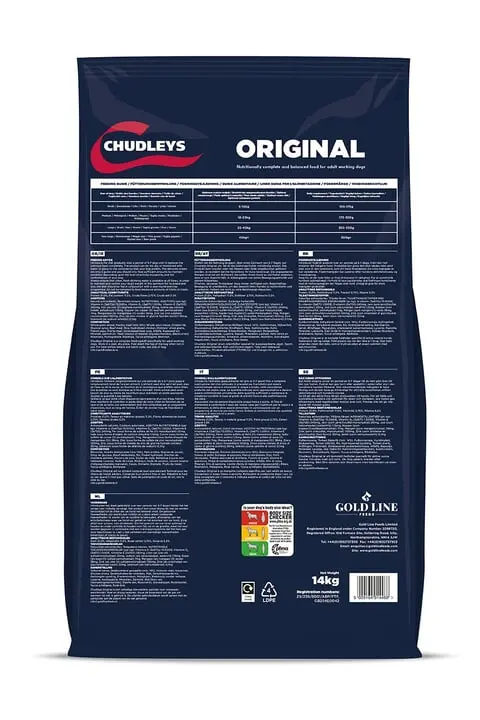 Chudleys Original dry food for working dogs consists on a bestselling muesli ration which is rich in chicken with added vegetables, making it ideal for fussy eaters. It is formulated specifically for dogs in light work, those that maintain weight easily or during rest periods. Helps to support overall performance in terms of stamina, energy and quick recovery after a hard day.