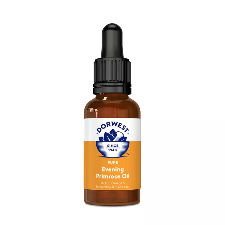 A quality preparation of evening primrose oil, this supplement contains the highest available levels of gamma linolenic acid (GLA), the omega 6 fatty acid, beneficial for skin and coat condition. Skin renewal, scurfiness, dryness and coat shine are all influenced by the important omega fatty acids. We recommend this preparation for show dogs, those breeds with long coats and after a moult or other conditions causing hair loss. Evening primrose is also well known for its ability to restore reproductive hormone imbalances which can affect behaviour and coat quality.