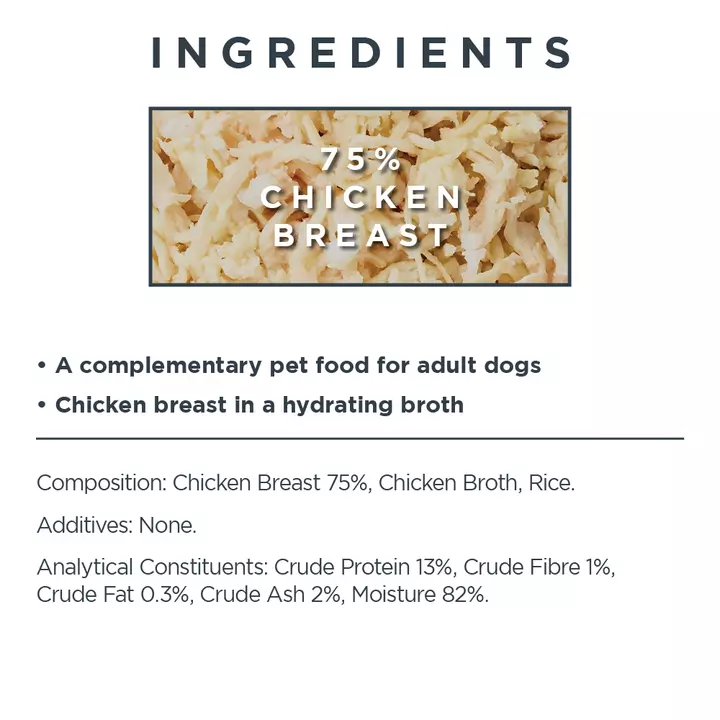 Chicken Breast 75%, Chicken Broth, Rice