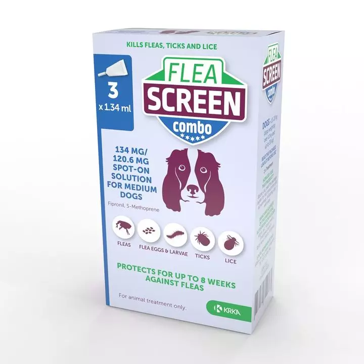 Fleascreen Combo Spot-on Solution for Dogs and Cats kills fleas on treated dogs and prevents eggs laid by fleas exposed to Fleascreen from developing for up to 8 weeks. Kills ticks on treated dogs for up to 4 weeks and treats infestations of biting lice