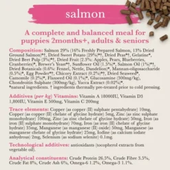 - Salmon (29%) (16% Freshly Prepared Salmon, 13% Dried Ground Salmon)*†, Dried Sweet Potato (29%)*†, Dried Peas*†, Gelatine*, Dried Beet Pulp (3%)*†, Dried Fruit (2.3%: Apples, Pears, Blueberries, Cranberries)*, Brewer’s Yeast*†, Sunflower Oil (1.5%)*, Salmon Oil (1%)*†, Dried Botanicals (0.6%: Fennel, Nettle, Dandelion)*, Mannan-oligosaccharide (0.5%)*, Egg Powder*†, Chicory Extract (0.2%)*†, Dried Seaweed*, Camomile (0.2%)*, Flaxseed Oil (0.1%)*, Glucosamine (300mg/kg), Chondroitin Sulphate (300mg/kg), Yucca Extract (0.02%)*.​