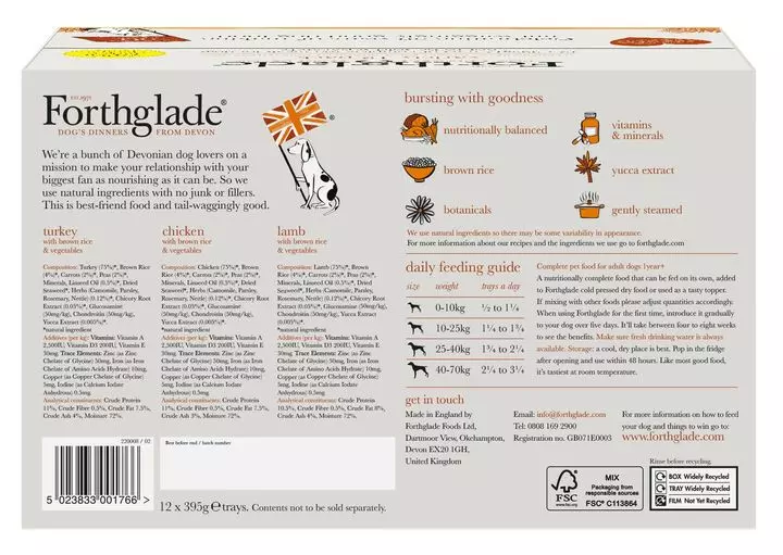 Turkey with brown rice & vegetables – Crude Protein 11%, Crude Fibres 0.5%, Crude Oils & Fats 7.5%, Crude Ash 4%, Moisture 72%.