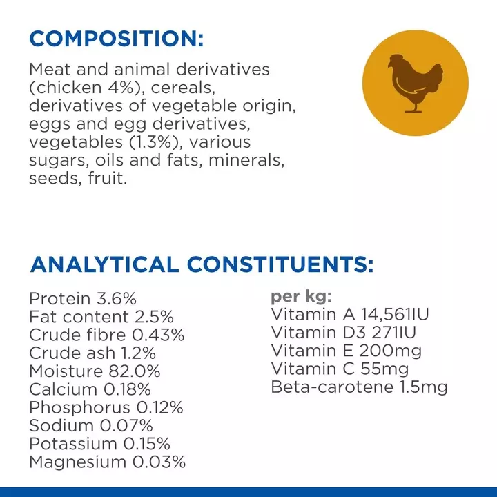 - Analytical Constituents: Protein 3.6%, Fat content 2.5%, Crude fibre 0.43%, Crude ash 1.2%, Moisture 82.0%, Calcium 0.18%, Phosphorus 0.12%, Sodium 0.07%, Potassium 0.15%, Magnesium 0.03%; per kg: Vitamin A 14,561IU, Vitamin D3 271IU, Vitamin E 200mg, Vitamin C 55mg, Beta-carotene 1.5mg.