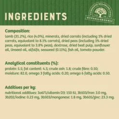 - lamb (31.2%), rice (4.0%), minerals, dried carrots (including 1% dried carrots, equivalent to 8.1% carrots), dried peas (including 1% dried peas, equivalent to 3.8% peas), dextrose, dried beet pulp, sunflower oil, linseed oil, alfalfa, seaweed (0.11%), fish oil, tomato powder.
