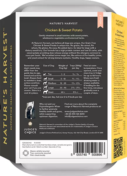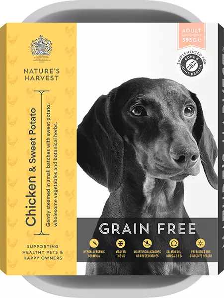 Nature’s Harvest Grain Free Chicken & Sweet Potato is ideal for dogs with a dietary sensitivity to other meats. No artificial flavours, colours or preservatives are used in this product with glucosamine & chondroitin to support correct joint function. Natural rubbed herbs and vitamin C are added for their antioxidant properties as well as yeast extract that aids in supporting the immune system. Salmon oil is used to enhance omega 3 and 6 fats for maintenance of healthy skin and coats.