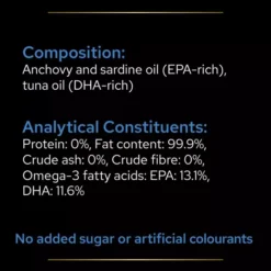 - Protein: 0%, Fat Content: 99,9%, Crude Ash: 0%, Crude fibre: 0%, Omega-3 fatty acids: EPA: 13,1%, Omega-3 fatty acids: DHA: 11,6%.