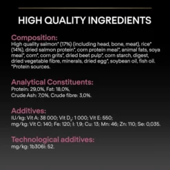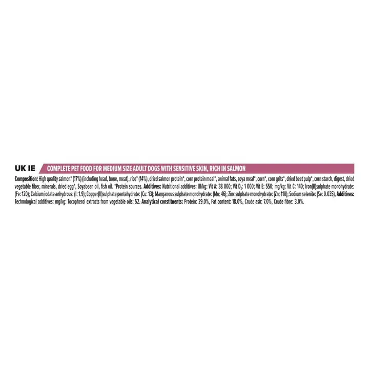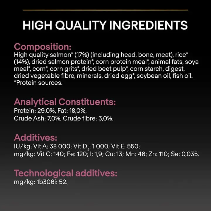 Composition: Salmon* (17%), Rice* (14%), Dehydrated salmon protein*, Maize gluten meal*, Animal fat, Maize*, Soya meal*, Maize grits*, Dried beet pulp*, Maize starch, Digest, Cellulose, Minerals, Dried egg*, Soybean oil, Fish oil.