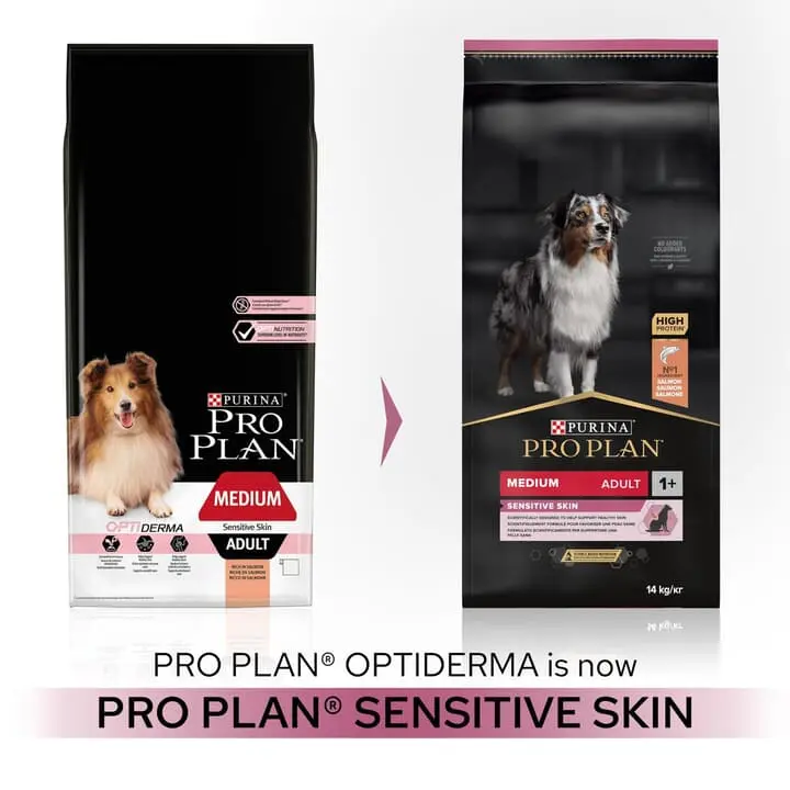 PURINA® PRO PLAN® DOG Medium Adult Sensitive Skin with OPTIDERMA® is a dry dog food for adult dogs who have sensitive skin. If your medium-sized dog has sensitive skin, this complete dog food can support their needs and help target their sensitivity. OPTIDERMA® is a combination of nutrients that target the skin, helping to support their naturally healthy coat.