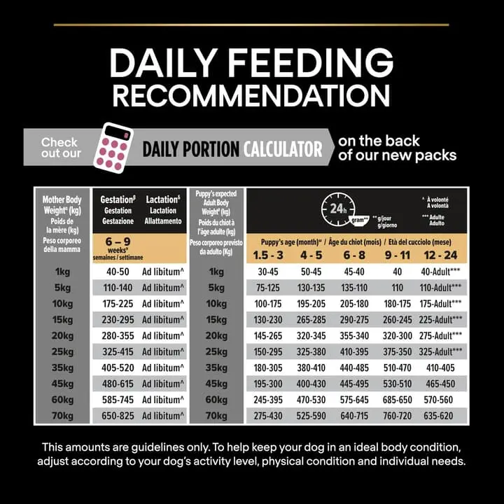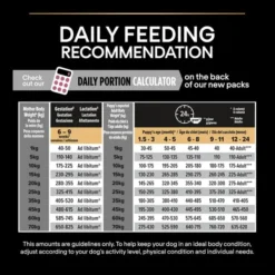 Feeding Guide: See table for recommended daily feeding amounts. These amounts are guidelines only. To help keep your dog in an ideal body condition, adjust according to your dog’s activity level, physical condition and individual needs. Clean, fresh water should be available at all times. To monitor your dog’s health, consult a veterinary surgeon regularly.