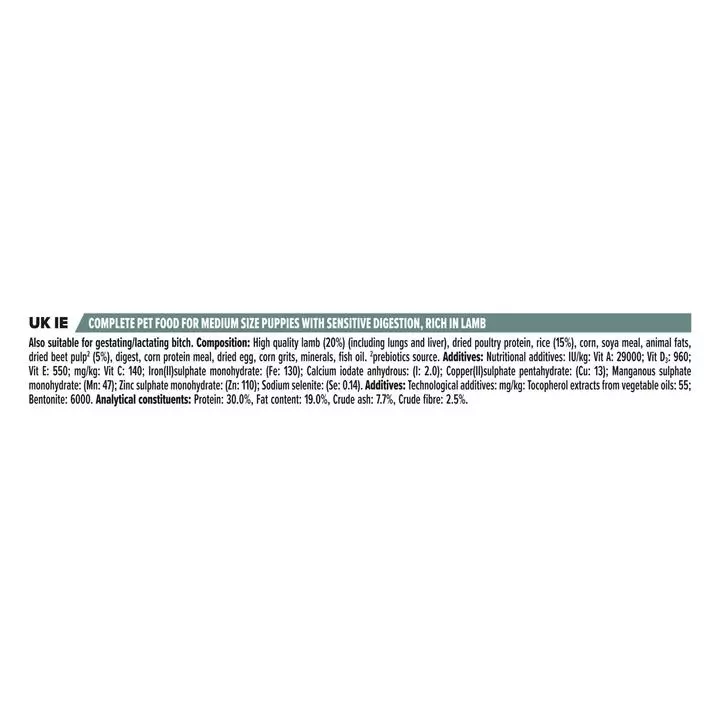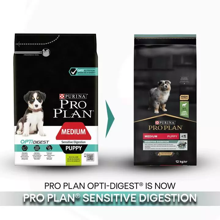 PURINA® PRO PLAN® DOG Medium Puppy Sensitive Digestion Rich in Lamb is a complete dry food for medium-sized breed puppies. It contains OPTIDIGEST®, a specifically chosen balance of nutrients suitable for your puppy’s size and age which can help support sensitive digestion for his overall health. It is also suitable for gestating or lactating bitches.
