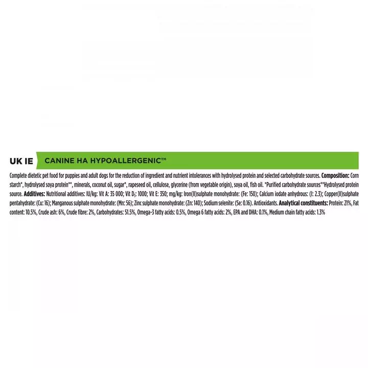PURINA® PROPLAN® VETERINARY DIETS Canine HA Hypoallergenic is a complete hypoallergenic veterinary diet for the diagnosis and management of food allergies in dogs of all ages, including puppies. Some dogs may suffer from food allergy, which can cause skin discomfort and/or digestive upsets.