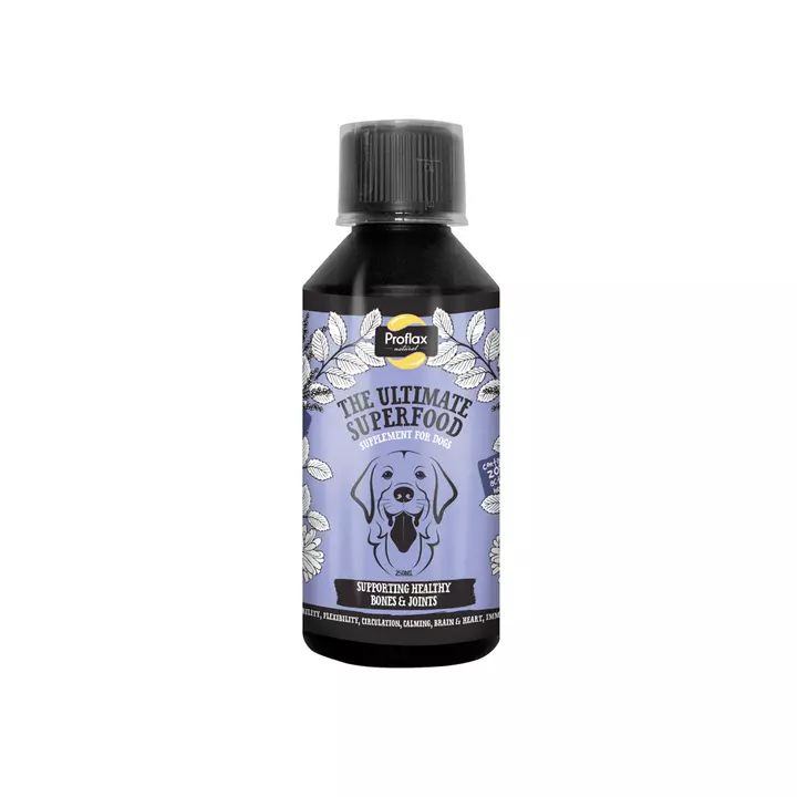 Proflax Natural Bone & Joint consists of 80% cold pressed flax oil and a 20% vet approved formula of 6 active herbal extracts. This highly nutritious ready blended superfood supplement offers multiple health benefits which will help to keep your dog in tip top condition. This blend specifically helps to maintain strong bones, aid joint mobility and circulation whilst having a calming and relaxing effect. It also supports immune, digestive, brain and heart functions, regulates metabolism and hormone function and cleanses and detoxes the kidneys of any built up toxins to promote optimal health. Bursting with minerals, protein and fibre this delicous supplement is offered in an easy to feed liquid that, when used regularly, completes a nutritious feeding plan. Ideal for all feeding regimes including natural, raw food diets.