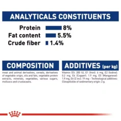 Meat and animal derivatives, oils and fats, cereals, vegetable protein extracts, derivatives of vergetable origin, minerals, yeasts, various sugars, molluscs and crustaceans Crude ash: 1.4%. Crude fibre: 1.4%. Crude oil fats: 5.5%. Moisture: 81%. Protein: 8%.