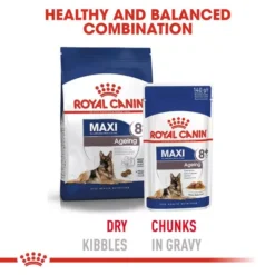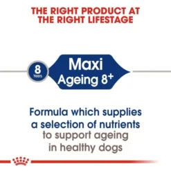 ROYAL CANINĀ® Maxi Ageing 8+ is suitable for adult dogs that weigh between 26kg- 44kg and is specially formulated with all the nutritional needs of your large dog in mind. ROYAL CANINĀ® Maxi Ageing 8+ contains an exclusive complex of antioxidants, as well as omega-3 fatty acids such as EPA and DHA to support ageing in senior, larger breed dogs. Ageing can be particularly difficult for larger breed dogs due to the wear and tear to their joints.